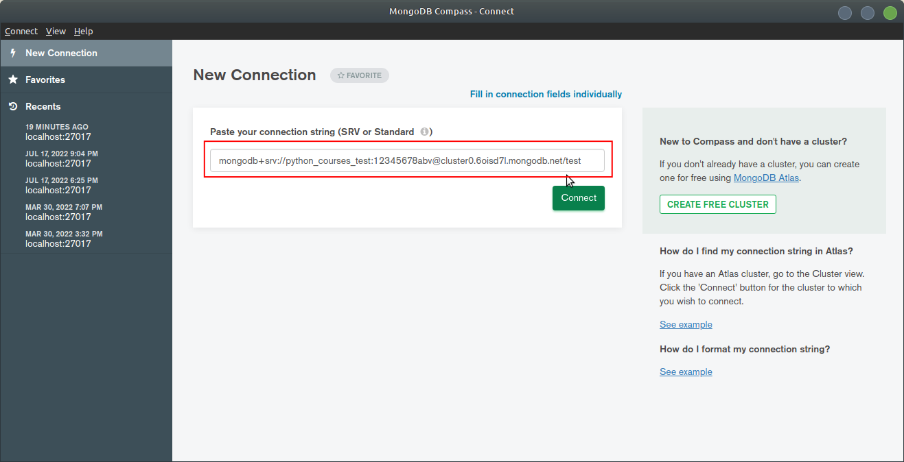 use command. In example above, this is "python_course" db.mongodb://username:password@localhost:27017/dbnamemongodb+srv://server.example.com/mongodb+srv:// URIs